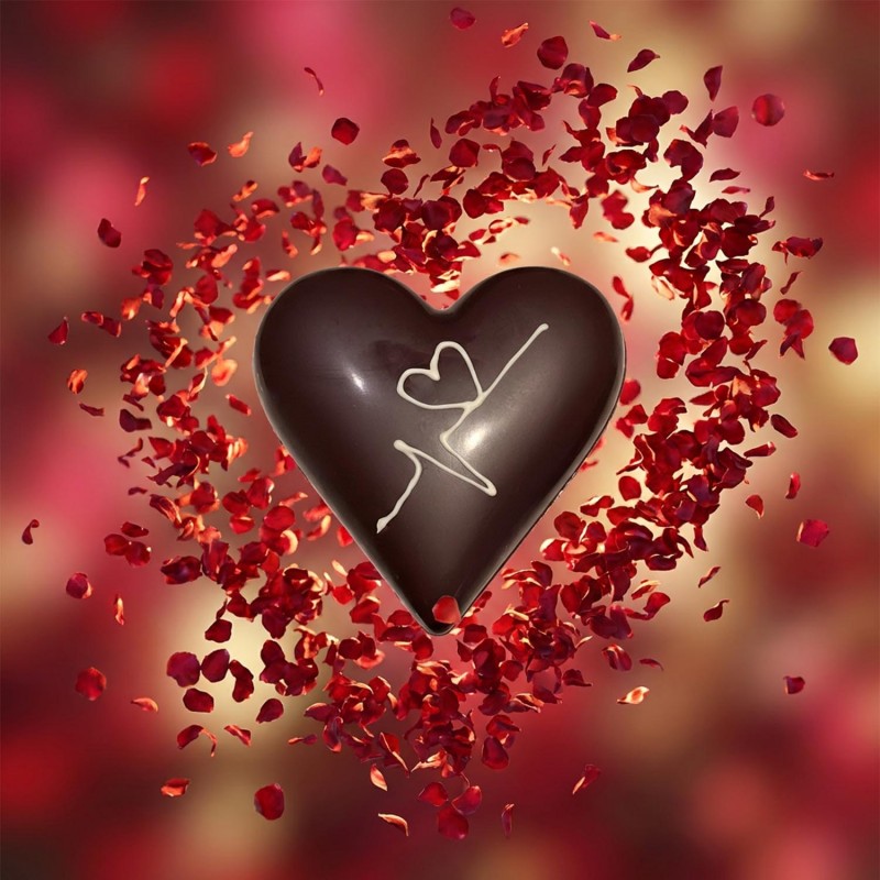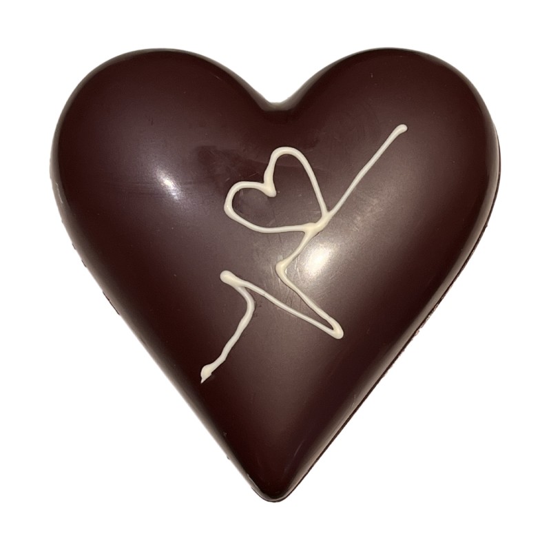 Coeur en chocolat noir 66% ou lait 38% garni de bonbons de chocolat.