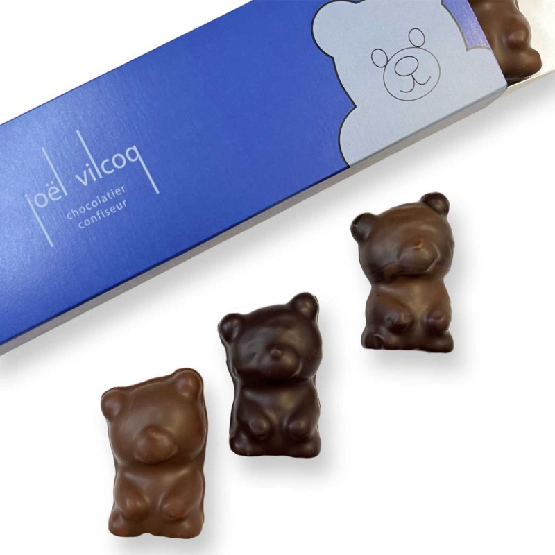 6 Oursons à la guimauve, framboise enrobé de chocolat noir, mangue/fruit de la passion enrobé de chocolat au lait et vanille enrobé de chocolat noir et lait.
