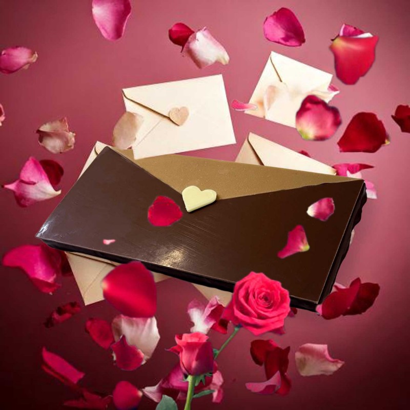 Tablette au praliné feuilletine, chocolat Noir 66%, au lait 38% et blanc 33%.